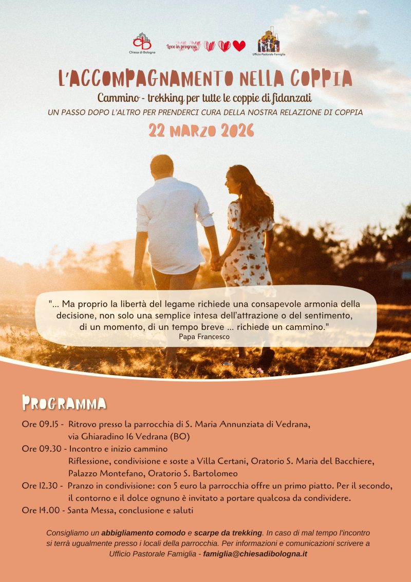 Chiediamo a chi ha intenzione di partecipare se gentilmente ce lo comunica scrivendo a: famiglia@chiesadibologna.it.