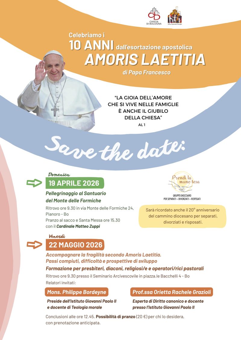 Il tema dell’incontro è: Accompagnare la fragilità secondo Amoris Laetitia. Passi compiuti, difficoltà e prospettive di sviluppo. Ritrovo alle ore 9.30 presso il Seminario Arcivescovile. Interverranno Mons. Philippe Bordeyne (preside dell’Istituto Giovanni Paolo II e docente di Teologia morale) e la prof.ssa Orietta Rachele Grazioli (esperta di diritto canonico e docente presso lo stesso Istituto). Si concluderà alle 12.45. Per chi desidera possibilità di pranzo (20 euro) con prenotazione anticipata entro il 15 maggio.